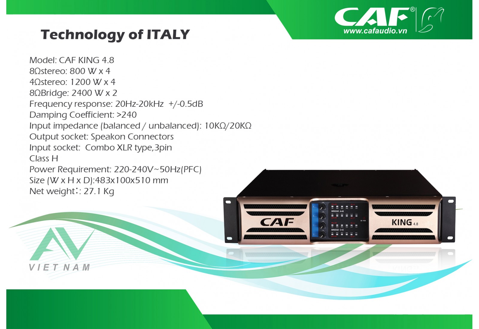 Cục đẩy công suất dường như là thiết bị không thể thiếu trong dàn âm thanh Karaoke chuyên nghiệp. Để đáp ứng tốt hơn nhiều yêu cầu từ khách hàng, cục đẩy CAF King 4.8 ra đời giúp dàn âm thanh của bạn có chất lượng âm thanh tốt hơn. Là sản phẩm tới từ thương hiệu CAF nổi tiếng, CAF King 4.8 vô cùng tuyệt vời không những bởi ngoại hình nhỏ gọn, sang trọng mà chất lượng cũng “khỏi phải bàn thêm”. Mời Quý khách hàng xem thông số kỹ thuật chi tiết ở phần phía trên để hiểu rõ hơn về sản phẩm.