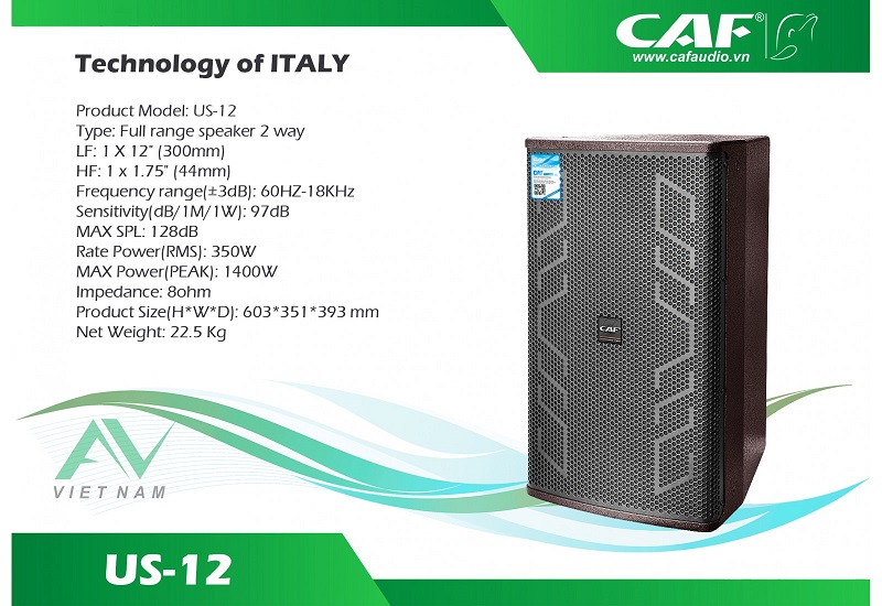 Là dòng loa của CAF Audio có chất lượng âm thanh tốt được đánh giá cao trong các dòng loa CAF US-12 có tiếng trung mềm mượt ấm áp, bass trắc mạnh, tiếng tress sáng rõ CAF US-12 đã được lắp đặt hầu hết trong các phòng hát karaoke cao cấp thậm chí nhiều gia đình cũng đã mua và sử dụng, lý tưởng được biết đến nhờ sự nổi tiếng của chất lượng âm thanh cùng độ bền vượt thời gian bên cạnh đó là mẫu mã với kiểu dáng đẹp hiện đại.