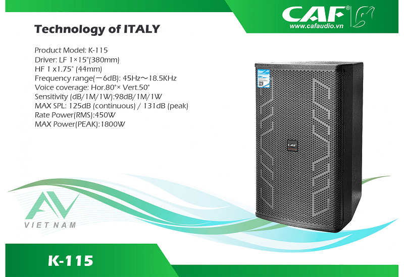 Là dòng loa của CAF Audio có chất lượng âm thanh tốt được đánh giá cao trong các dòng loa của hãng CAF AUDIO, CAF K-115 có tiếng trung mềm mượt ấm áp, bass trắc mạnh, tiếng tress sáng rõ CAF K-115 đã được lắp đặt hầu hết trong các phòng hát karaoke cao cấp thậm chí nhiều gia đình cũng đã mua và sử dụng, lý tưởng được biết đến nhờ sự nổi tiếng của chất lượng âm thanh cùng độ bền vượt thời gian bên cạnh đó là mẫu mã với kiểu dáng đẹp hiện đại.