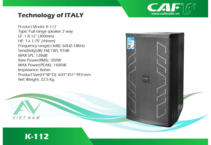 Là dòng loa của CAF Audio có chất lượng âm thanh tốt được đánh giá cao trong các dòng loa của hãng CAF AUDIO, CAF K-112 có tiếng trung mềm mượt ấm áp, bass trắc mạnh, tiếng tress sáng rõ CAF K-112 đã được lắp đặt hầu hết trong các phòng hát karaoke cao cấp thậm chí nhiều gia đình cũng đã mua và sử dụng, lý tưởng được biết đến nhờ sự nổi tiếng của chất lượng âm thanh cùng độ bền vượt thời gian bên cạnh đó là mẫu mã với kiểu dáng đẹp hiện đại.
